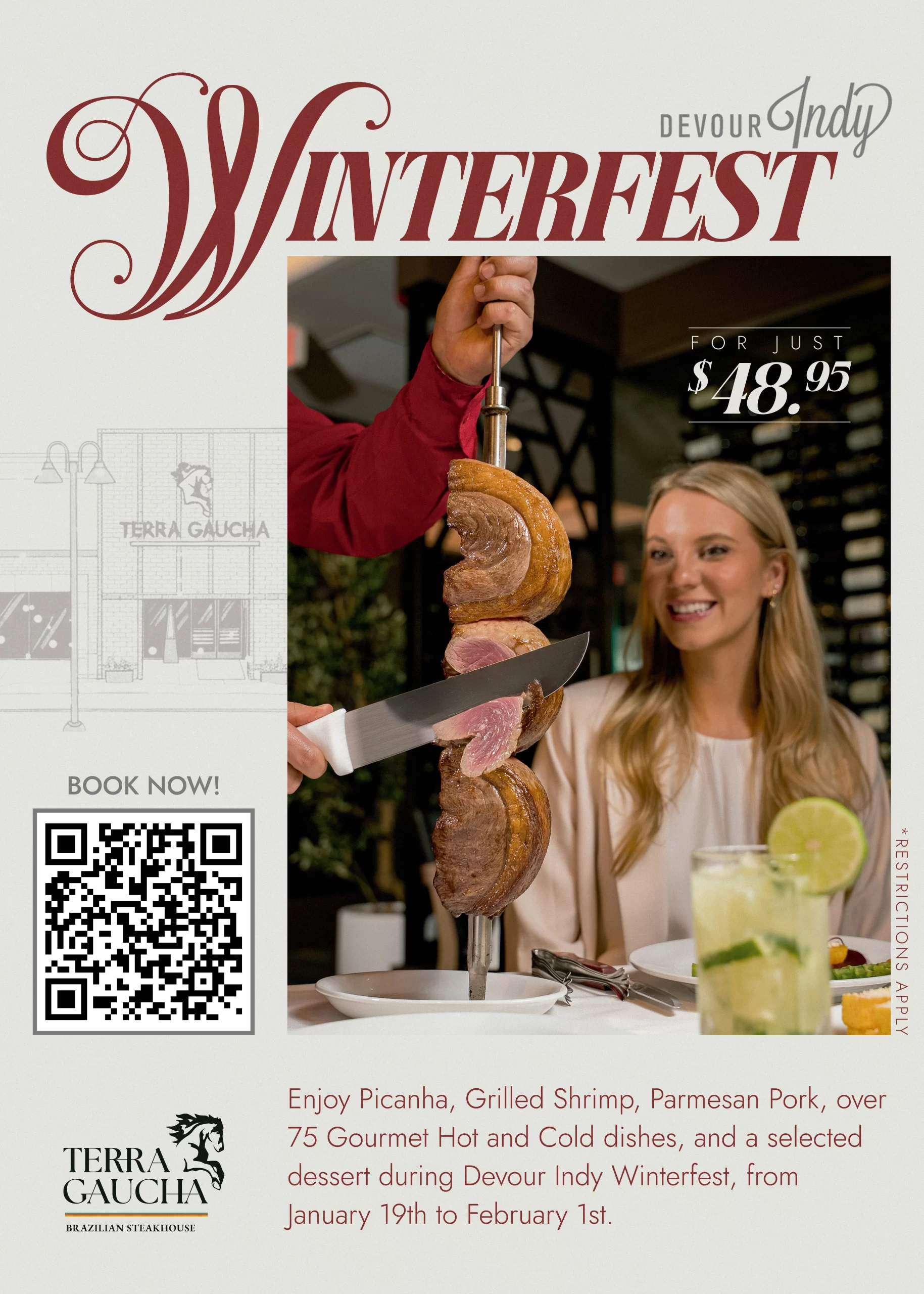 For just $48.95, indulge in the full Gaucho-style experience featuring endless fire-roasted cuts*. This exclusive invitation includes our house specialty Picanha (Premium Sirloin Cap) and savory Lamb Steak. This cultural feast is only available from January 19th to February 1st. Reserve your table now. 🔥